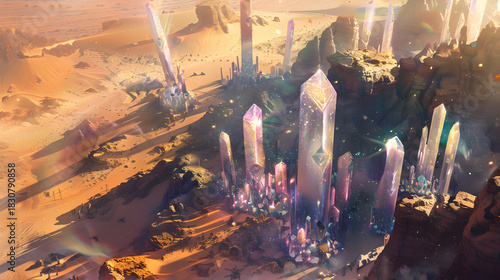 aerial view of desert landscape with giant crystal