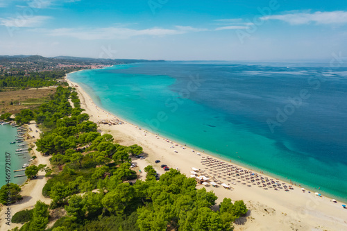 Aerial view of famous Lagoon beach in Chalkidiki, Kassandra peninsula. Aegean sea, Greece