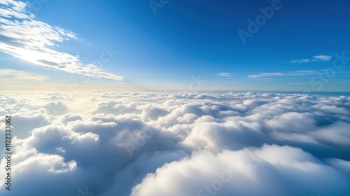 sky, cloud, sun, blue, white, aerial, view, up high, high, altitude, horizon, light, bright, day, weather, nature, scene, landscape, background, texture, pattern, beauty, serenity, peace, freedom, immensity, open, roomy, majestic, powerful, dramatic, dreamy, soft, fluffy, cumulus, sunny, clear, calm, tranquil, atmosphere, heaven, flight, travel, wonder, inspiration, hope, energy, optimism, air