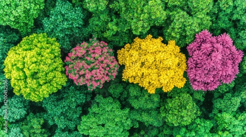 Aerial view of four colorful trees in a lush green forest, symbolizing diversity or environmental protection