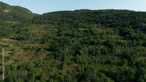 Aerial view of green forested hills and untouched wilderness in Serbia country. Drone photography of Balkan nature landscape