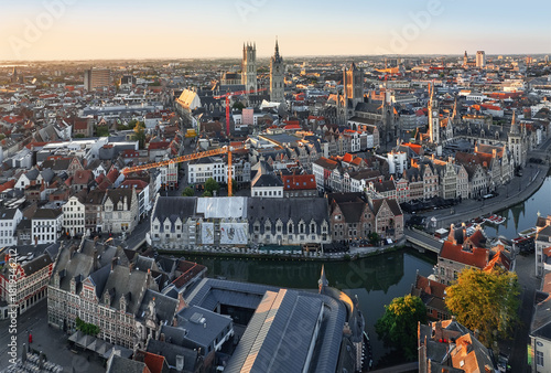 Aerial view of historic buildings bathed in golden light meet the serene waters, with St. Nicholas' Church and Ghent Belfry standing tall, Ghent, Flanders, Belgium.