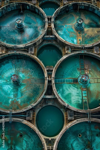 Aerial View of Industrial Water Tanks with Rusty Metal Structures and Turquoise Water, Showcasing Industrial Architecture and Engineering Design in a Symmetrical Pattern
