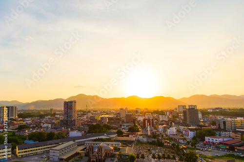 Aerial View of Ipoh ,Malaysia during sunset. soft focus,blur due to long exposure. visible noise due to high ISO.