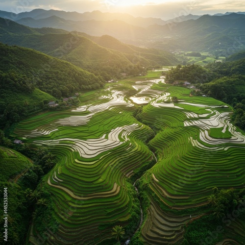 rice, terrace, paddy, field, aerial, view, landscape, green, nature, agriculture, farming, rural, mountain, hill, vale, sunrise, sunset, gold, hours, sunlight, asia, southeast, vietnam, terraced, field, agricultural, natural, scenic, countryside, cultivation, farmland, hillside, water, crop, plant, ecosystem, environment, ecology, texture, pattern, line, curve, photo, drone, image, picture, photo