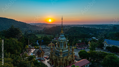 Aerial view of Mae Klang Waterfall Temple in Chiang Mai with the sunrise casting warm hues in calm sky. The tranquil setting highlights the serene beauty of the temple and the natural landscape.