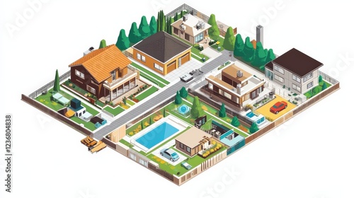 Aerial View of Modern Neighborhood with Different House Designs and Outdoor Spaces Including Swimming Pool, Garden, and Driveways on Vibrant Landscape