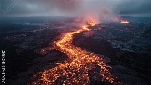 aerial, view, molten, lava, cutting, dark, volcanic, landscape, sky, cloud, sunlight, dramatic, fire, natural disaster