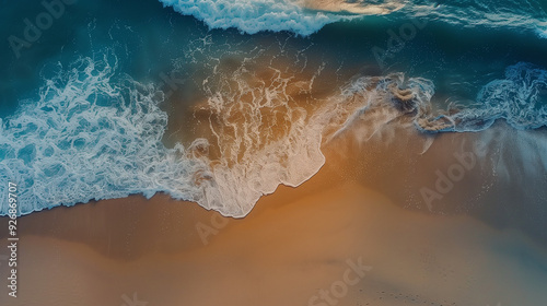 Aerial view of ocean waves gently washing onto a sandy beach