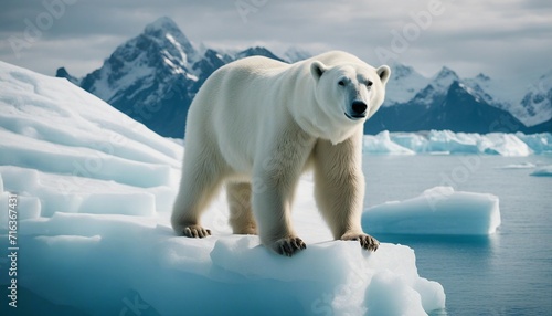 aerial view of polar bear on iceberg alone with mountain, glacier and ocean; global warming