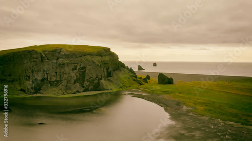 Aerial view of Reynisfjara Beach and surrounding landscape, Iceland