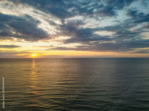 Aerial view of serene Baltic Sea at sunset, Leba, Poland.