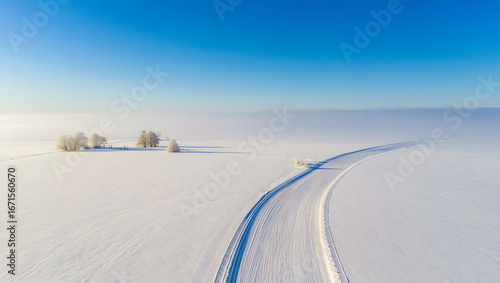 winter, snow, sky, blue, white, tree, road, field, landscape, cold, frost, serene, calm, peaceful, quiet, huge, open, aerial, view, nature, season, sun, light, shadow, track, path, glacé, tranquil, beauty, scenic, picturesque, horizon, distance, clear, bright, day, stillness, solitude, expansive, untouched, pure, serenity, wintery
