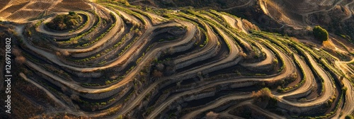 vinery, terrace, hillside, agriculture, farming, aerial, view, landscape, row, curve, path, dirtied, earth, stone, wall, plant, vine, grape, wine, growing, cultivation, rural, country, scenic, natural, beauty, texture, pattern, line, organic, gold, sunlight, light, shadow, autumn, season, green, brown, colours, image, photo