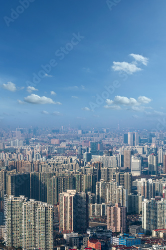 aerial view of Shanghai cityscape and modern skyscraper city in misty sky background behind pollution haze, in Shanghai, China.