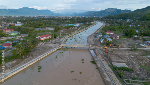 aerial view, river, bridge, waterway, rural, landscape, village, canal, infrastructure, construction site, residential area, development, engineering, transportation, urban, planning, indonesia, scenic, road, network, architecture, progress, city, expansion, nature, town, water, building, sky, background, construction, river bank, transport, up high, industrial, industry, environment, scene, scenery, topview, site, concrete, structure, work, steel, machine
