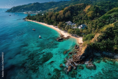 beach, tropical, ocean, turquoise, water, coast, island, hill, mountain, lush, green, landscape, cliff, rock, shore, sunny, travel, vacation, relaxation, paradise, tour tourism, coastal, aerial, view, scenery, nature, seacoast, serenity, calm, tranquil, beautiful, scenic, exotic, holiday, waterfront, resort, palm, boat, clear, bright, sandy