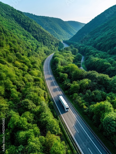 aerial, highway, truck, vale, green, forest, road, transportation, vehicle, nature, mountain, landscape, travel, tree, curve, scenic, route, sunlight, destination, summer, country, journey, countryside, winding, logistic, delivery, path, automobile, drive, environment, foliage, timberland, forestry, vista, panorama, expedition, greenery, distance, adventure, freedom, automotive, vacation, horizon, exploration, ecosystem, navigation