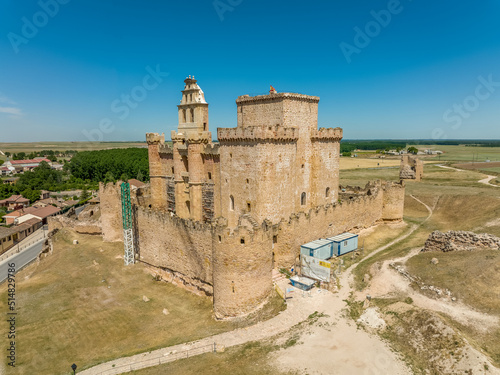 Aerial view of Turégano a village and municipality of Spain in the province of Segovia, Castile and León. Medieval feudal castle with donjon, circular towers integrating church of San Miguel