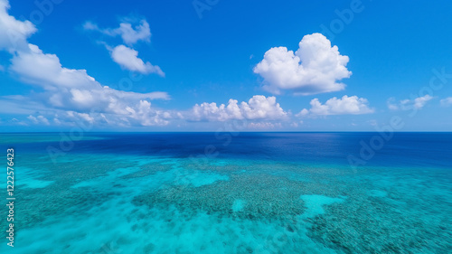 Aerial view of vibrant turquoise ocean with coral reefs and fluffy clouds. serene landscape evokes sense of tranquility and natural beauty