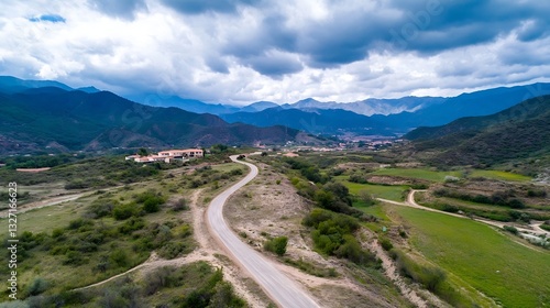 Aerial view of winding road through lush valleys with distant mountains : Generative AI