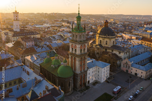 Aerial view on Dominican Church and Dormition Church in Lviv, Ukraine from drone