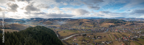Aerial view over Intorsura Buzaului city from Covasna county in Romania during a cloudy winter day at the bottom of Ciucas Mountains.