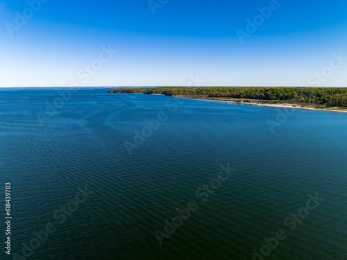 Aerial view over the calm waters in Oyster Bay near Lloyd Harbor, New York on a sunny day