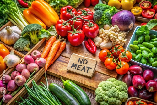 Aerial View: Ripe Vegetables Kitchen Counter No Meat Sign Photography