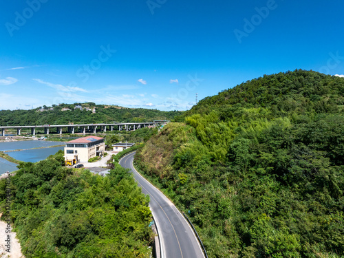 roadway, asphalt, sustainable, forest road, way, aerial view, drive, transport, hill, journey, car, transportation, aerial, mountain, road, highway, forest, green, nature, landscape, travel, building, house