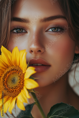Aesthetic Model Photo, Portrait of a Beautiful Woman with Flower in Magazine Cover Style
