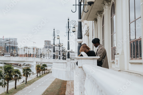 casual attire, human relationships, trendy, view, warmth, happy, love, palm tree, multicultural, street, friends, elegant, daytime, tender, connection, affection, lifestyle, urban, young, together, bridge, atmosphere, couple, bonding, building, style, city, lamp-post, serene, leisure, quiet, moment, friendship, city life, architecture, romance, intimate, diversity, casual clothes, scenic, people, partnership, joy, hugs, romantic, fashion, comfort