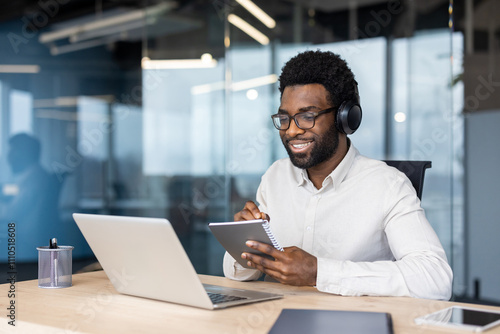 African American businessman engaged in online learning using laptop and notebook. Wearing headphones, he is focused and smiling in modern office environment.