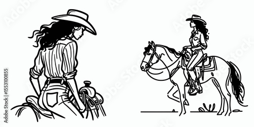 cowgirl, western, cartoon, clip art, cowboy, silhouette, vector, illustration, african, american, up, line, art, graphic, drawing, line art, cut-out, black-and-white, ornament, isolated, shape, set, collection, element, white, object, symbol, black, concept, design, style, monochrome, outline, doodle, minimalist, simple, white background, minimal, female, rancher, mounting, horse, ready, adventure, rural, life