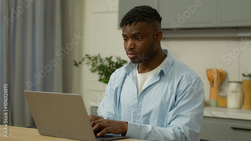 African American ethnic man freelancer student male biracial guy businessman householder houseowner using laptop studying working online distant work chatting computer shopping internet home kitchen