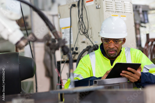 African American male engineer worker using tablet with the automatic robotic machine in the factory. Black male technician worker working with control automatic robot arm system welding