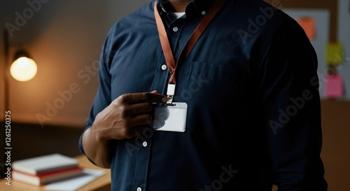 id, badge, lanyard, identification, work, office, security, african, american, male, holder, workspace, employee, name, tags, business, professional, workplace, uniform, shirt, supply, credentials, desk, identity, job, man, men at work, corporate, card, dark, blank, attire, environment, staff, member, document, setting, access, background, nameplate, lighting