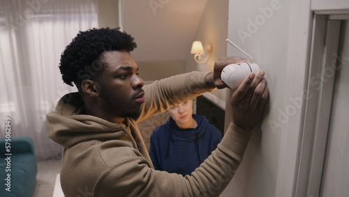man, woman, couple, family, cctv, security camera, put, connect, install, installation, wall, home, apartment, mount, fastening, wire, cable, caucasian, african, african american, diverse, monitoring, safety, camera, guard, tracking, system, installer, installing, datum, database, cyberspace, privacy, video, protect, protection, surveillance, private, personal, observation, reconnaissance, modern, technology, house, concept