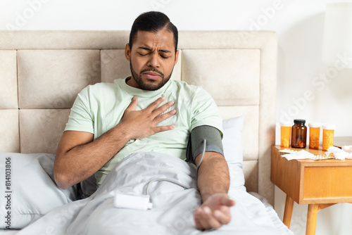 African American man is seen sitting in his bed with a concerned expression, clutching his chest in discomfort white checking blood pressure with tonometer