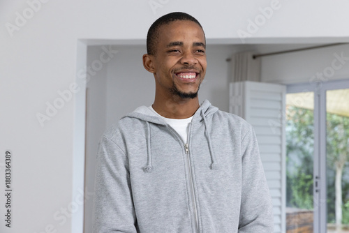 African American man standing at home smiling glancing at patio door, wearing gray hoodie white tee