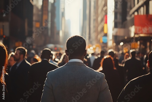 city landscape, city street, skyscraper, business district, crowd, people, pedestrian, rush hour, commuting, anonymous, backview, suit, businessman, professional, man, male, dark-haired, african american, city life, metropolitan, blurred background, depth of field, urban setting, modern architecture, street scene, business attire, office worker, city landscape, street light, shadow, golden hour