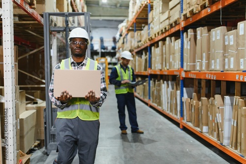 delivery, men at work, warehouse, african, box, american, distribution, storehouse, shipping, man, stock, package, carrying, store, logistic, job, shipment, order, transportation, good, factory, work, container, business, industry, courier, supply, depot, freight, cardboard, cargo, unloading, male, mail, shelf, parcel, inventory, cardbox, rack, loader, post, professional, shelf, forklift, clipboard, packing, occupation, indoor, loading