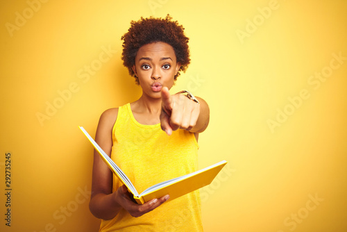 African american woman reading a book over yellow isolated background pointing with finger to the camera and to you, hand sign, positive and confident gesture from the front