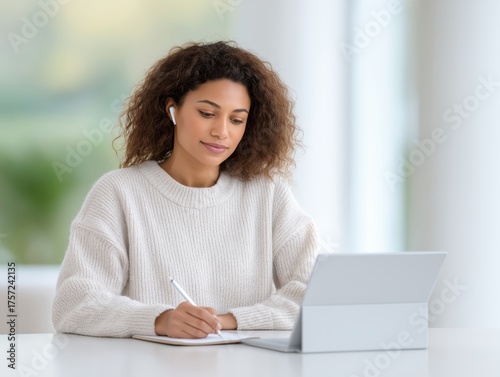 woman, african, american, student, tablet, writing, note, earbud, modern, workspace, natural, light, focused, engaged, technology, education, contemporary, design, calm, atmosphere, inspiration, creativity, digital, lifestyle, casual attire, interior, furniture, home, office, concentration, soft, cosy, environment, professional, elegant, stylish, young, intelligent, thoughtful, task, activity, leisure, communication, connection, innovation