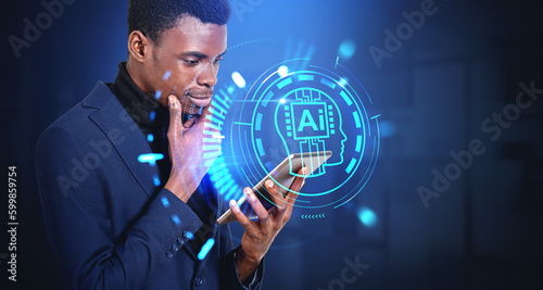 black man, ai, communication, using, tablet, technology, artificial, intelligence, digital, machine, learning, device, black, man, pensive, portrait, african, american, robot, help, human, work, process, productivity, concept, businessman, chat, bot, idea, virtual, assistant, generate, text, online, contraption, business, cyberspace, information, smart, conversation, hologram, icon, circuit, future, modern, automation, answer, question, connection