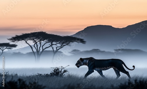 African savanna with a lion, featuring double exposure technique. Stock