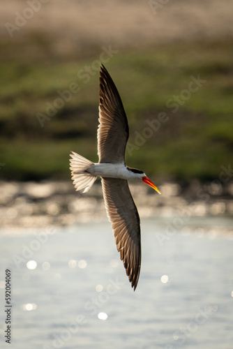 African skimmer (Rynchops flavirostris) crosses river with vertical wings in Chobe National Park; Chobe, Botswana