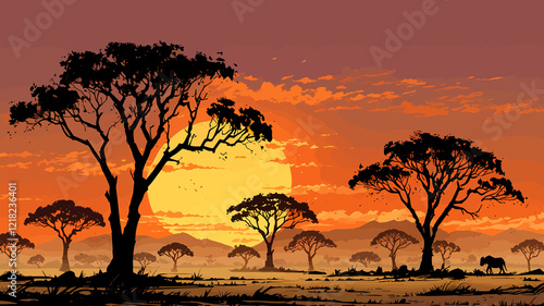 sunset, tree, silhouette, landscape, sky, nature, sun, tree, sunrise, orange, safari, cloud, light, kenya, vector, illustration, red, dusk, acacia, evening, park, travel, desert, beautiful, morning