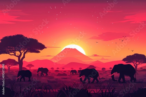 elephant, sunset, africa, savanna, wildlife, landscape, nature, silhouette, horizon, sky, mountain, grass, tree, animal, wild, tropical, safari, bush, plain, prairie, sun, dawn, gold, red, pink, orange, warm, light, evening, dusk, day, bright, digital, art, illustration, graphic, design