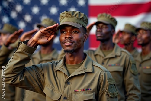 African-American Patriotic Soldiers Saluting with American Flag Background